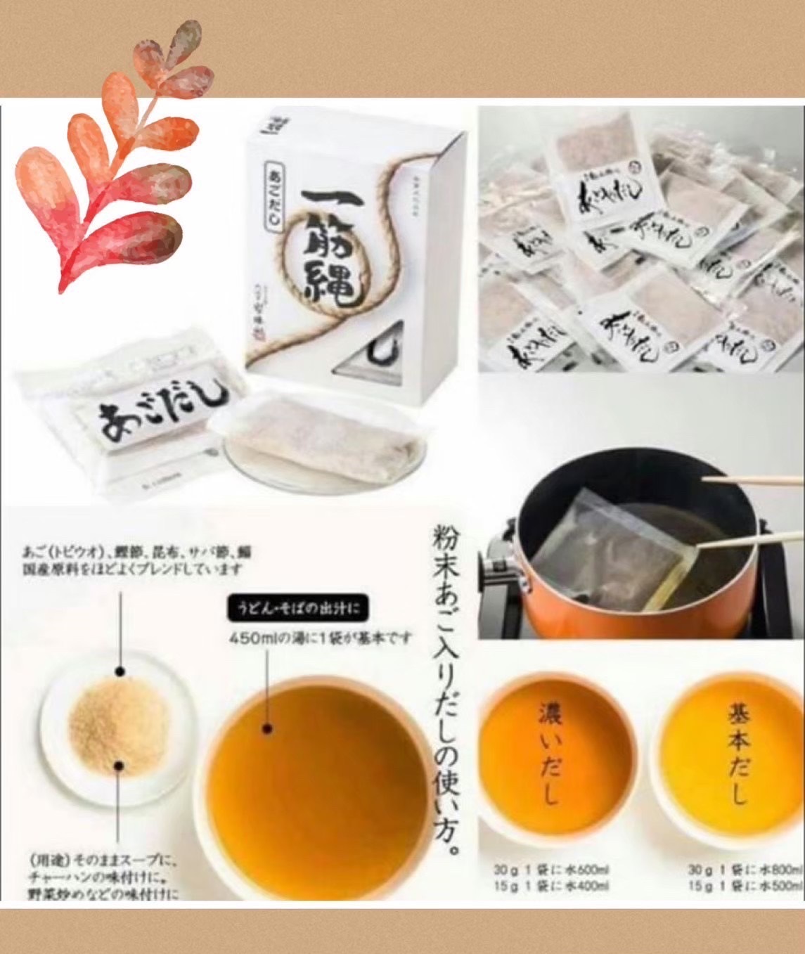 素 材:風味原料(鰹魚乾、細鰯乾、鯖魚乾、昆布、飛魚乾)、食鹽、砂糖、醬油粉(含小麥、大豆)/調味料(アミノ酸等)