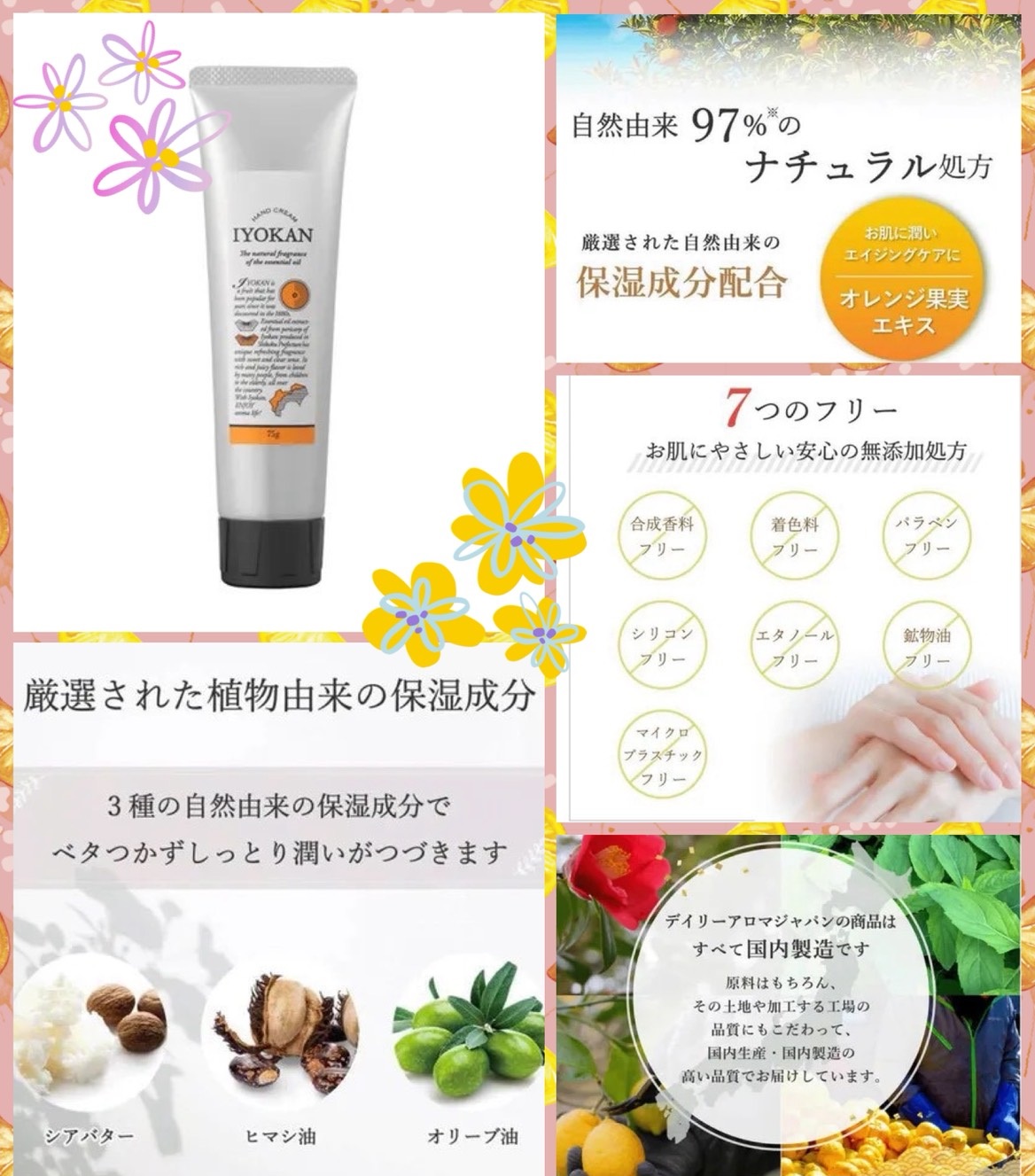 素 材:水、蓖麻油、甘油、硬脂醇、乳木果脂、(丙烯酸羟乙基/丙烯酰二甲基牛磺酸鈉)共聚物、橙果提取物、伊予柑果皮油*、橄欖果油、丙二醇、硬脂酸甘油酯(SE)、蘋果酸二異硬脂酯、異硬脂酸山梨坦、聚山梨醇酯60、碘丙炔基羥脲、BG【*使用自植物提取的精油。】