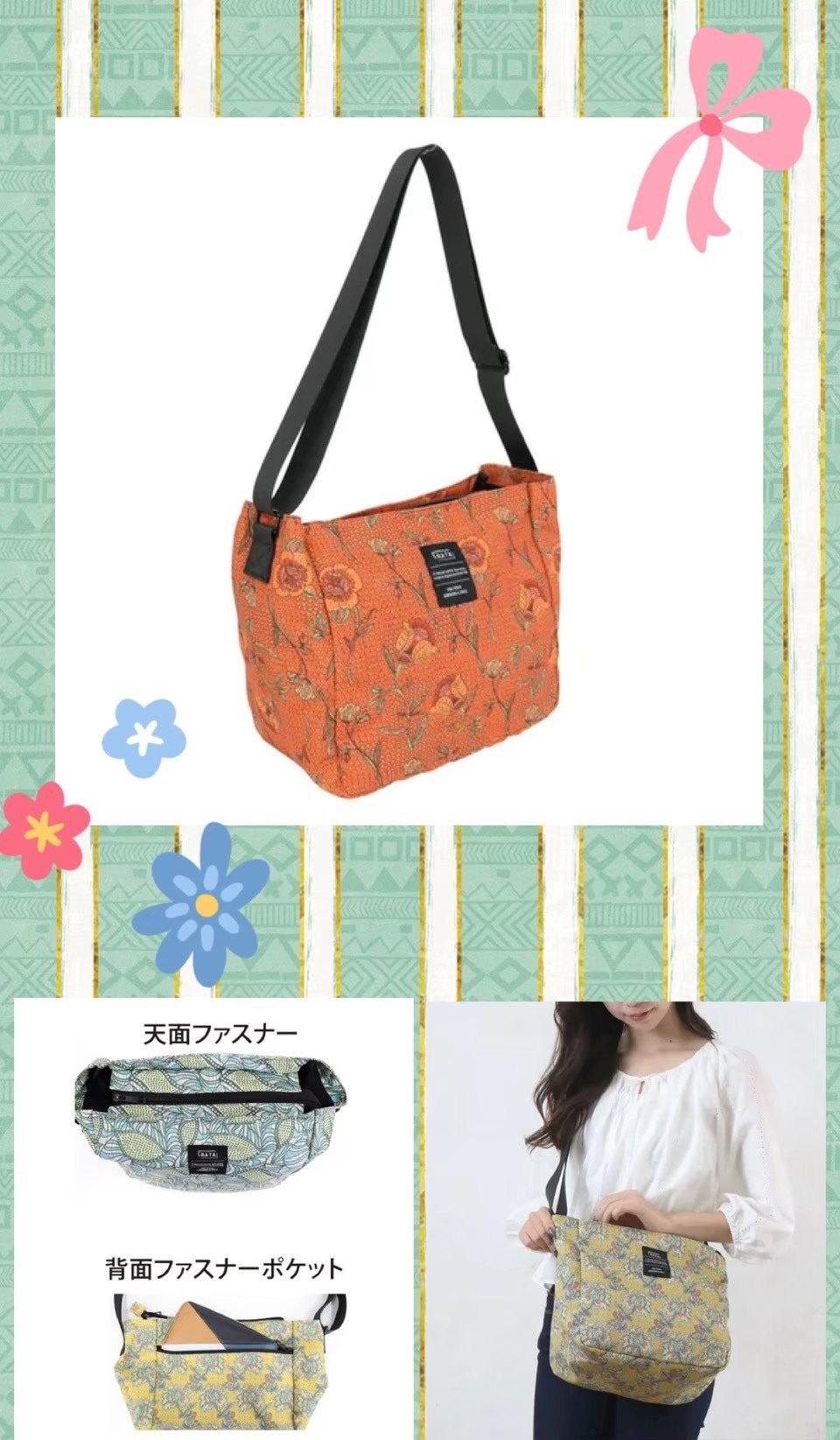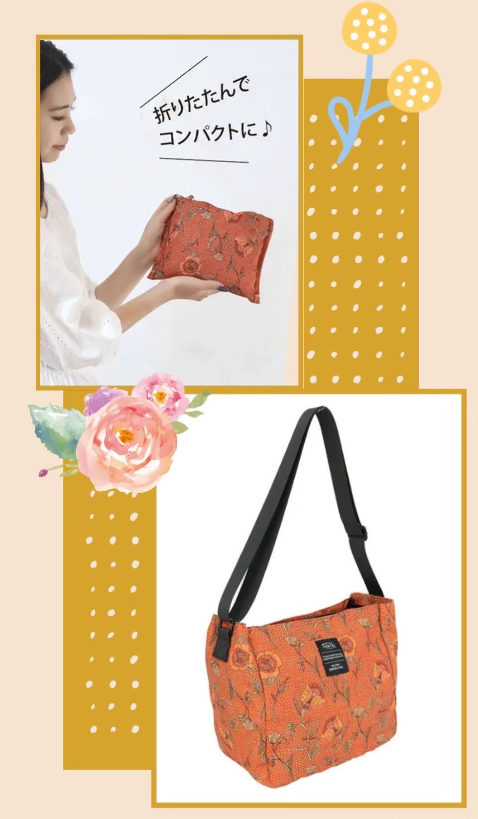 色彩斑斕的花卉圖案設計是可愛的單肩包,可以折疊並存放在內袋中,非常適合在旅行或外出時攜帶額外的行李時使用,可以很好地收納 A4尺寸和500ml容量的瓶子,對於攜帶大量行李的人來說非常理想。