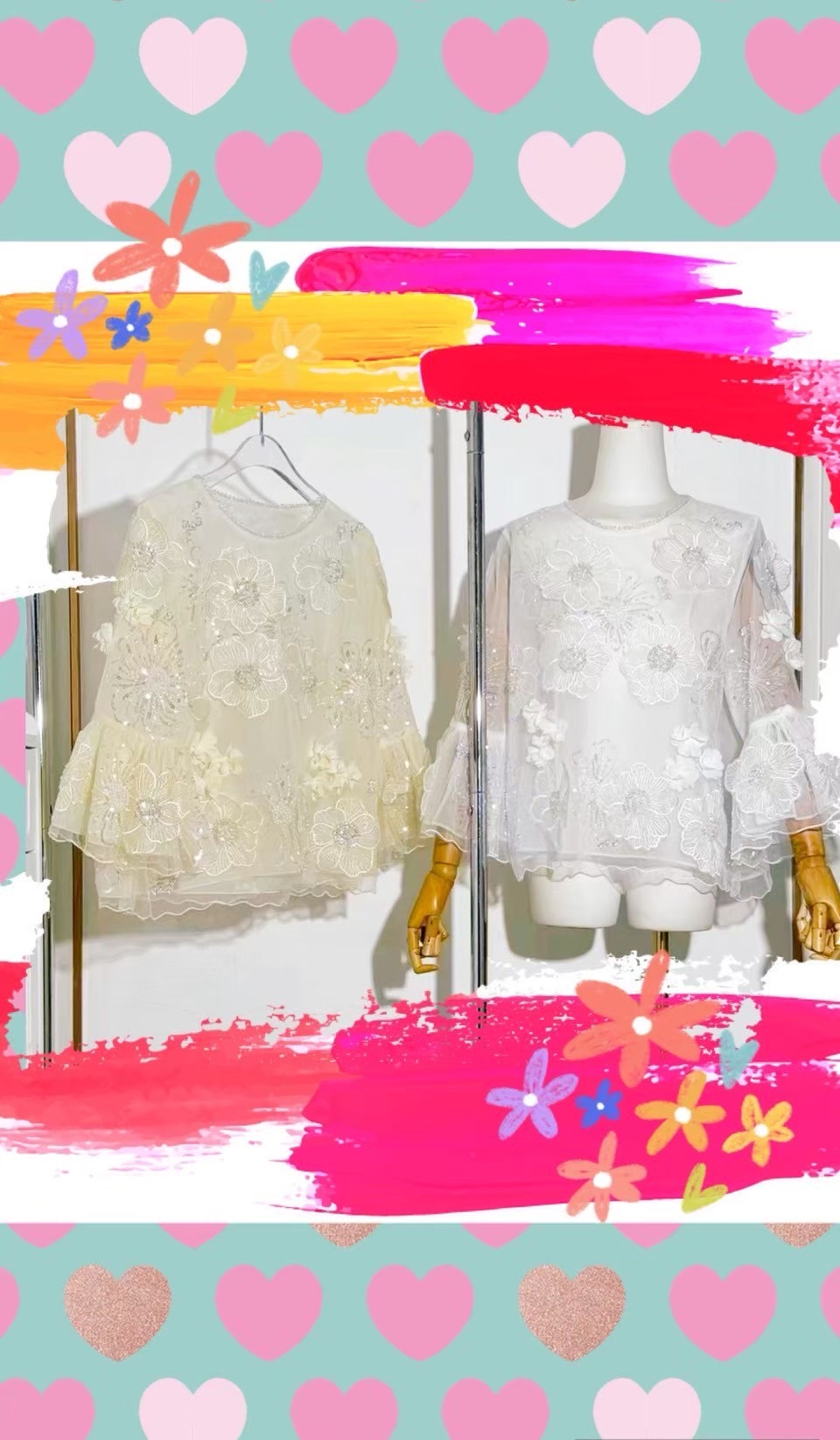 立體亮片銖花上衣,適度的透明度使其感覺輕盈,而喇叭袖則增添了一絲女性柔美氣息。