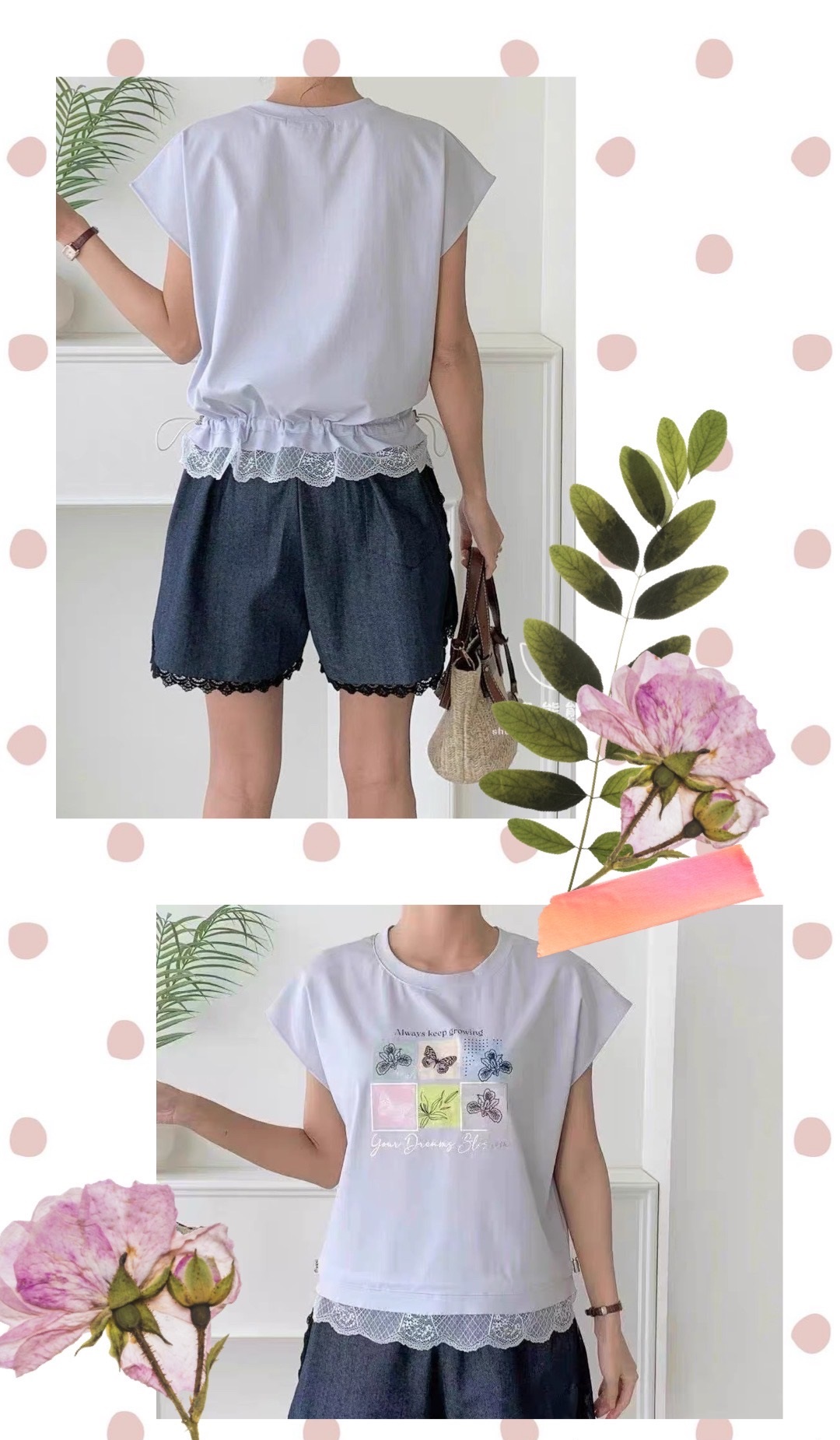 蕾邊抽繩上衣圓潤的小領口和下方的蕾絲襯托出柔美的亮點。